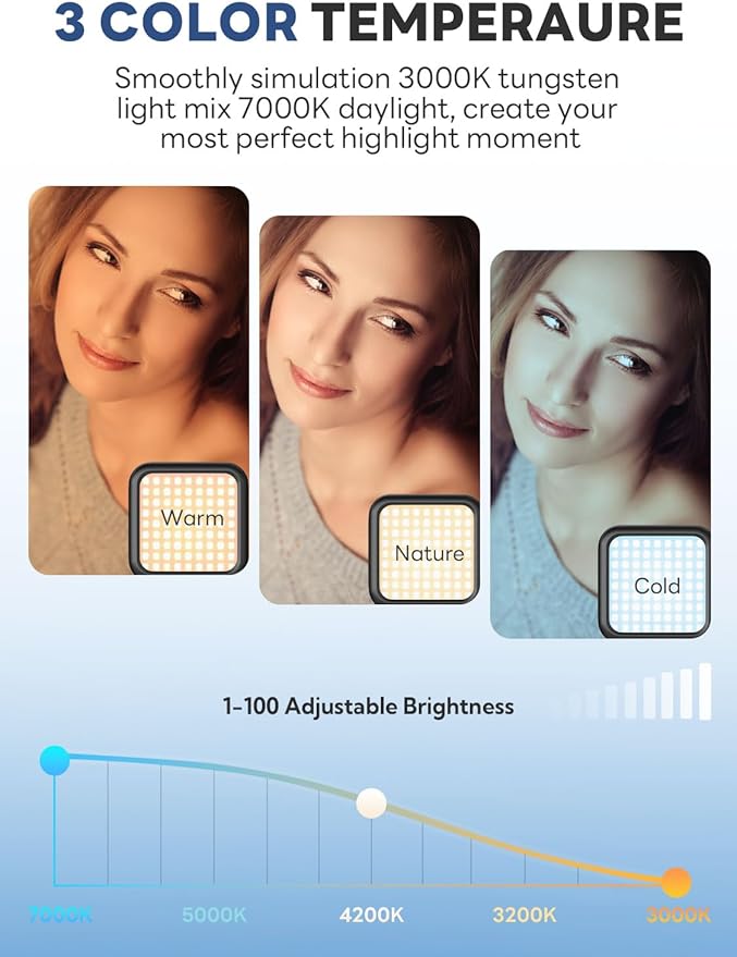 - 【Adjustable Fill Light】Easy control your lighting from 1% to 100% brightness to get the adjustable lighting for your setup. The color temperature can be adjusted from 3000k to 7000k for various shooting scenarios and several photography needs, which can light you up anytime anywhere if needed.