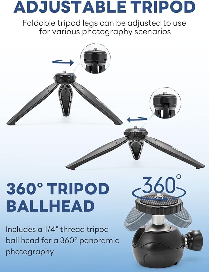 - 【 Patent Designed Phone Clip】Special designed auto-switch phone clip that is much compatible with multiple models of smartphone,for iPhone 16/15/14 Mini/Pro/Max, and versatile trip with a 360° ball head which gets the best view angle, and the height of tripod can be adjusted to make setups much more steady.