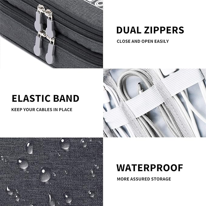 - 【DOUBLE LAYERS & WELL ORGANIZED】- This travel electronics organizer is designed with multiple pockets and various size of elastic bands providing great flexibility for organizing electronics accessories such as USB Cable Cord, Flash Drive, Wall Charger, SD Card, Hard Drive, Power Bank, Earbuds, Camera.A large zipper mesh pockets.