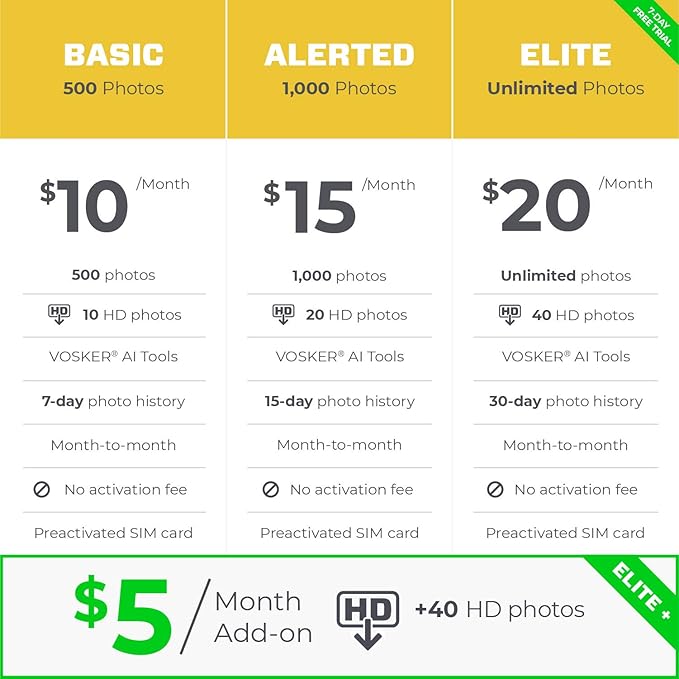- SIM CARD INCLUDED - Just set it up and let it get to work. No need to purchase a SIM card from a third-party service provider, all VOSKER cameras come with a preactivated SIM card for an easy activation. Monthly plan starts at $10/mo. for 500 alerts, $15/mo. for 1000 alerts or $20/mo. for unlimited alerts. Save 10% with annual billing. Free 7-day trial at activation.