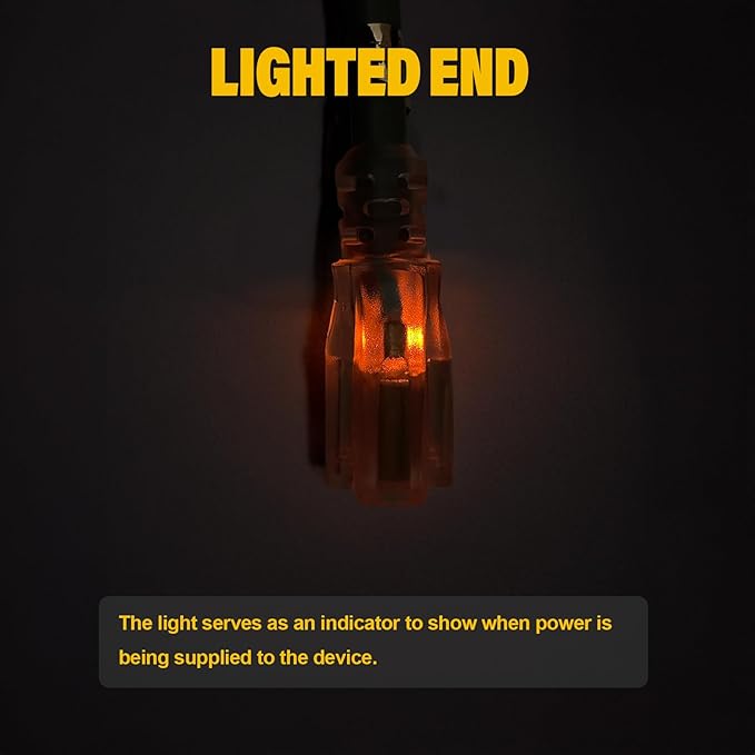 - Lighted Extension Cord End - LED indicator lights up when the cord is powered to let you know the triple tap extension cord is ready to use and easy to be found in the dark.