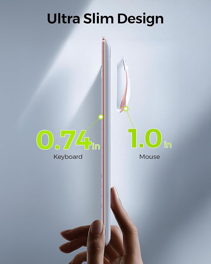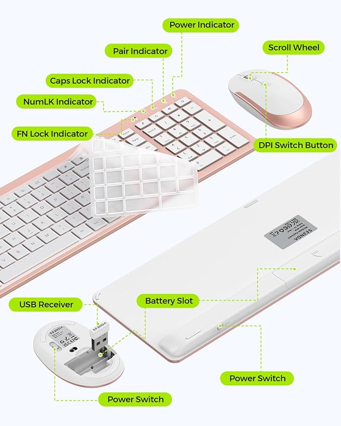 Wireless Keyboard and Mouse Combo - Full Size Slim Thin Wireless Keyboard Mouse with Numeric Keypad 2.4G Stable Connection Adjustable DPI - Rose Gold & White