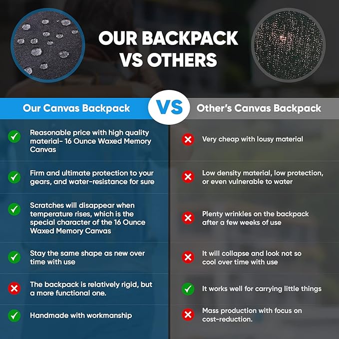 - Vintage Design. The camera backpack is made by waxed canvas and crazy horse leather, which is water-resistant, sturdiness and durable. Through wear and tear, it will show the changes in the shades of color and reflects the vintage look.