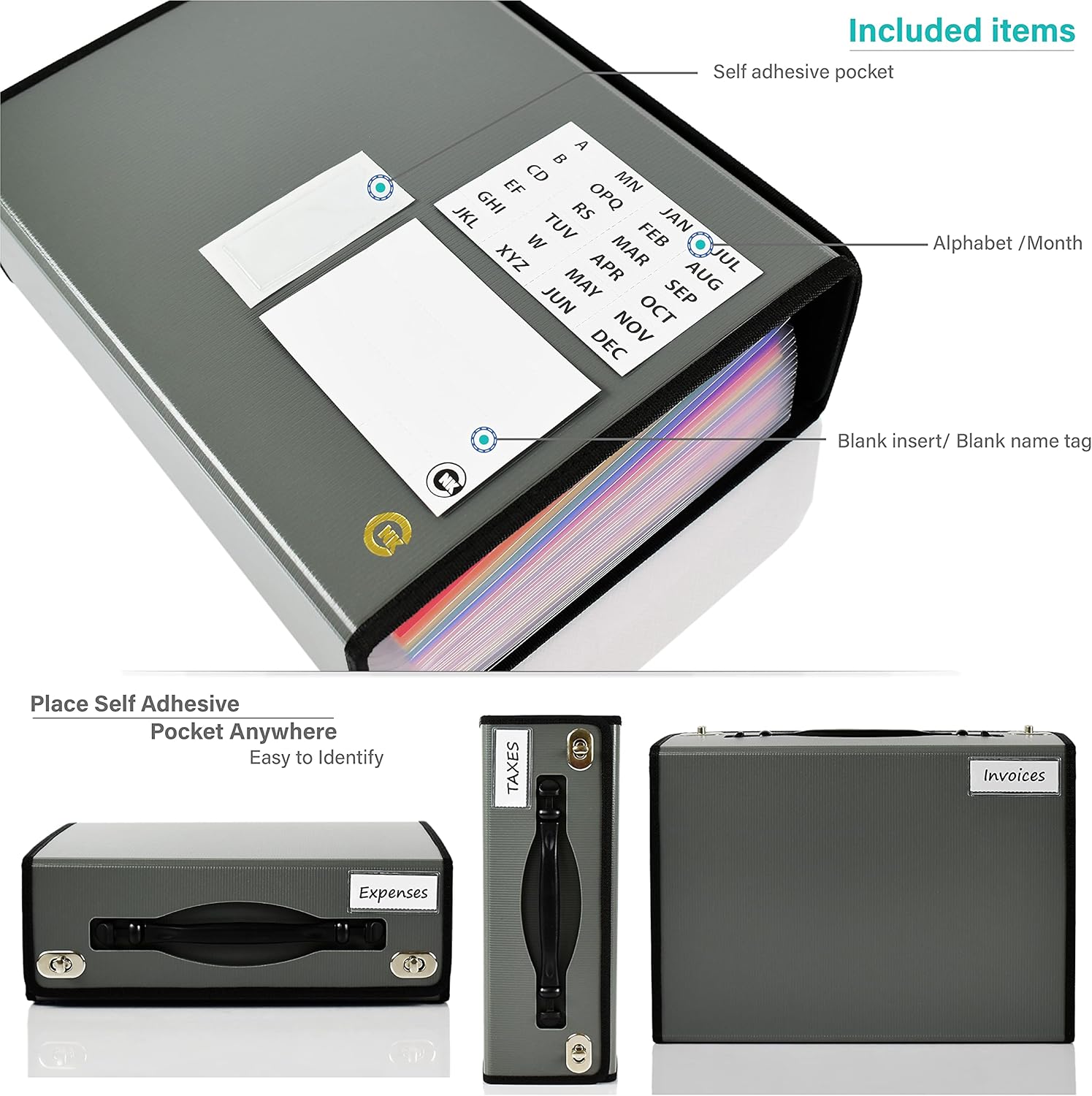 - The Self Adhesive Pockets is included to easily mark and categorize multiple organizers along with Alphabet, Month, Black Tags for your needs! The Month and Alphabet Printed Tags are big and bold to easily see and efficiently designed for easy insertion and removal