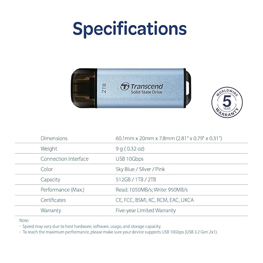 - High-Speed Data Transfer: With a USB 10Gbps transfer rate and SLC Cache technology, the ESD300 delivers read and write speeds of up to 1,050 MB/s and 950 MB/s, respectively.