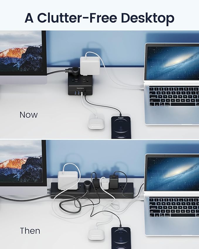 - ▶【All-Round Protection Technology】With a built-in 900J surge protector, our electrical multi-outlets will filter the minor surges in the circuit and shut off when an overwhelming surge occurs, like that caused by lightning. And the shell is made of Flame Retardant Material which is able to withstand temperatures high up to 1,380℉ (750℃). Besides, this universal power socket also has over-load/ short-circuit/ USB over-voltage/ USB over-current/USB over-heated protection.