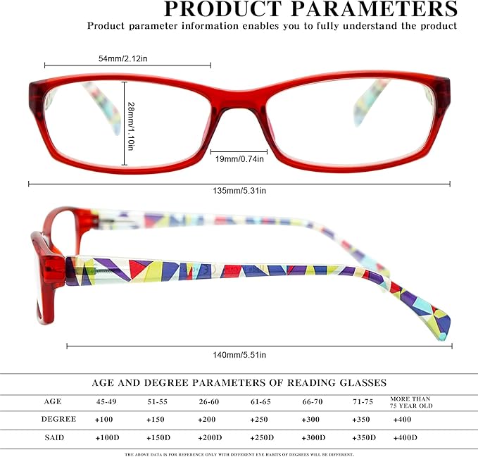 - [Unisex Reading Glasses]: Rectangular frames ,suitable for big, medium or small face.Total Width:(135mm/5.31inch) Temple Length:(130mm/5.12inch) Lens Width:(54mm/2.12inch) Lens Height:(28mm/1.10inch) Bridge Distance:(19mm/0.74inch.
