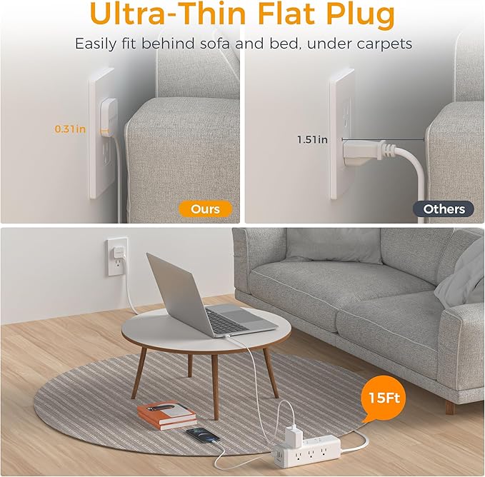 - 15 Ft Extension Cord: Extra long 15ft cord can more flexibility to reach distant outlets and hard to reach places; 0.12in flat cord can easily run along the wall, floor or under carpet without causing a bulge, protect your family from tripping, makes sweeping and mopping easier