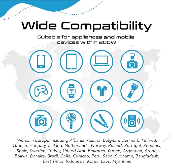 - [Type C G E/F output] swadapt technology allows this adapter to work in Europe including Albania Austria Belgium Denmark Finland Greece Hungary Iceland Netherlands Norway Poland Portugal Romania Spain Sweden Turkey United Arab Emirates Yemen ARGENTINA Aruba Bolivia Bonaire Brazil Chile Curacao Peru Saba Suriname Bangladesh East timor Indonesia korea Laos Myanmar