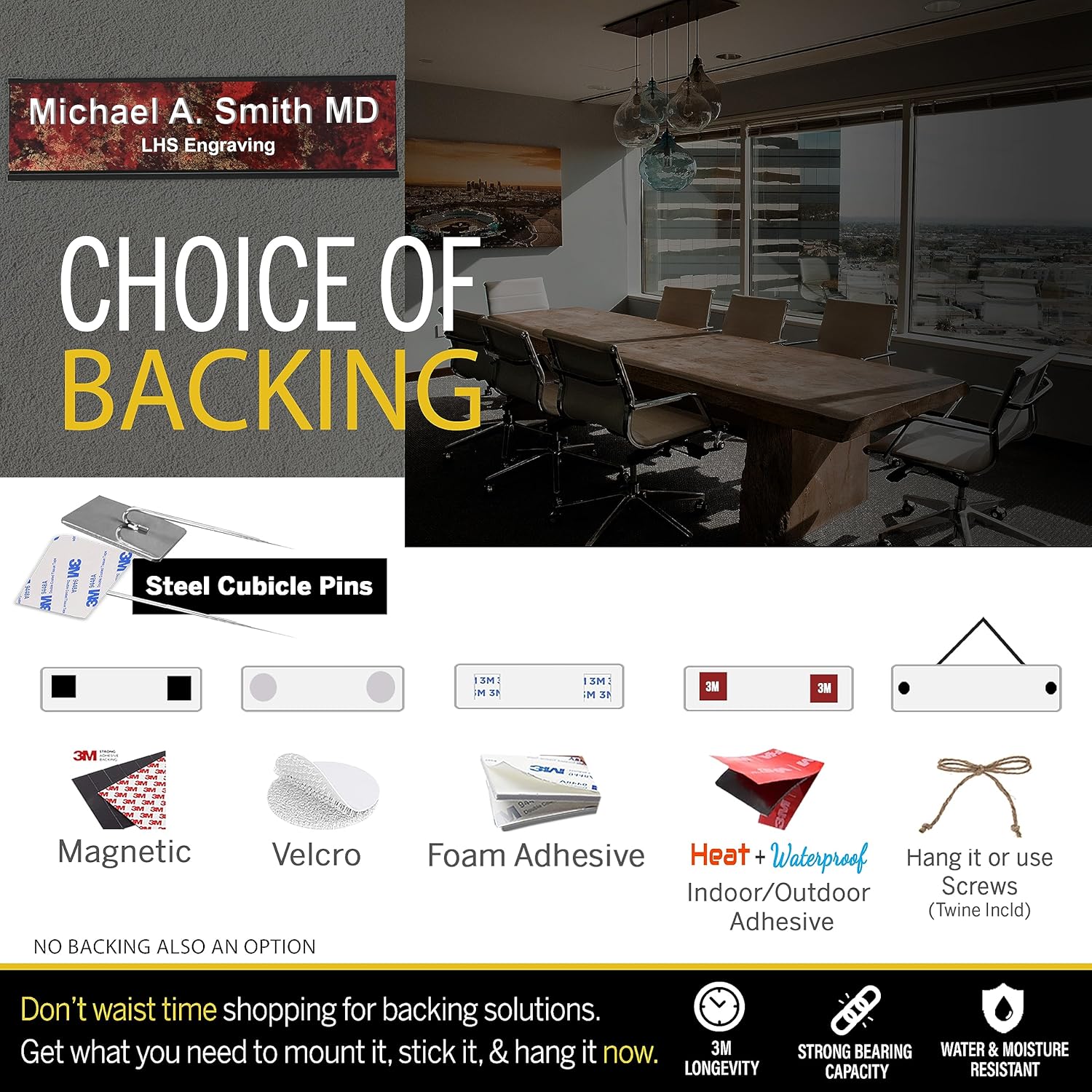 - π‘ Click Personalize: Add 3 lines of text | Option to add a desk, wall or a door holder or choose adhesive, hanging, cubicle pins, or all weather adhesive option
