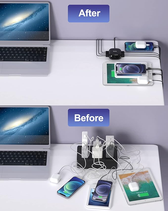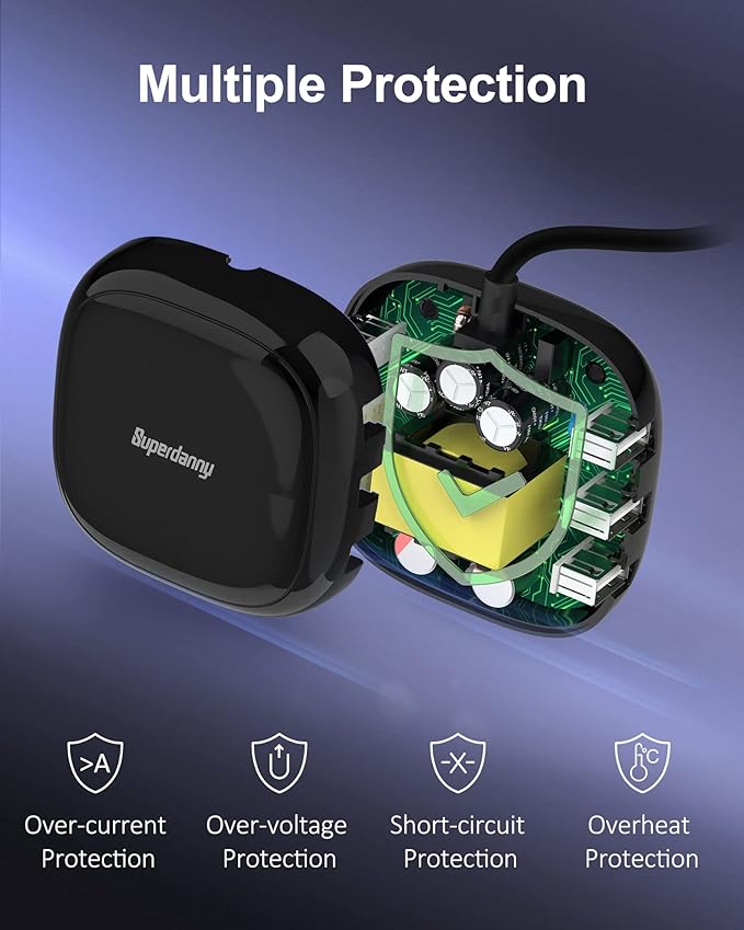 - 【Safe and Sound】Our multi charger station boasting protections against short-circuit, over-current, over-voltage, and overheat, making this USB charging hub safe enough to be placed wherever you need; Furthermore, this USB charger block ,can be placed even bedside or nightstand with a non-glaring indicator but never disturbs your sleep.