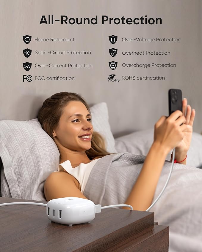 - 【Safe and Quiet】Our multi-USB charger station boasts all-round protection against short-circuit, over-current, over-voltage, and overheat, making it a reliable USB charging hub wherever you need it. This USB charger block has a soft glare-free indicator that won’t disturb your sleep on the nightstand.