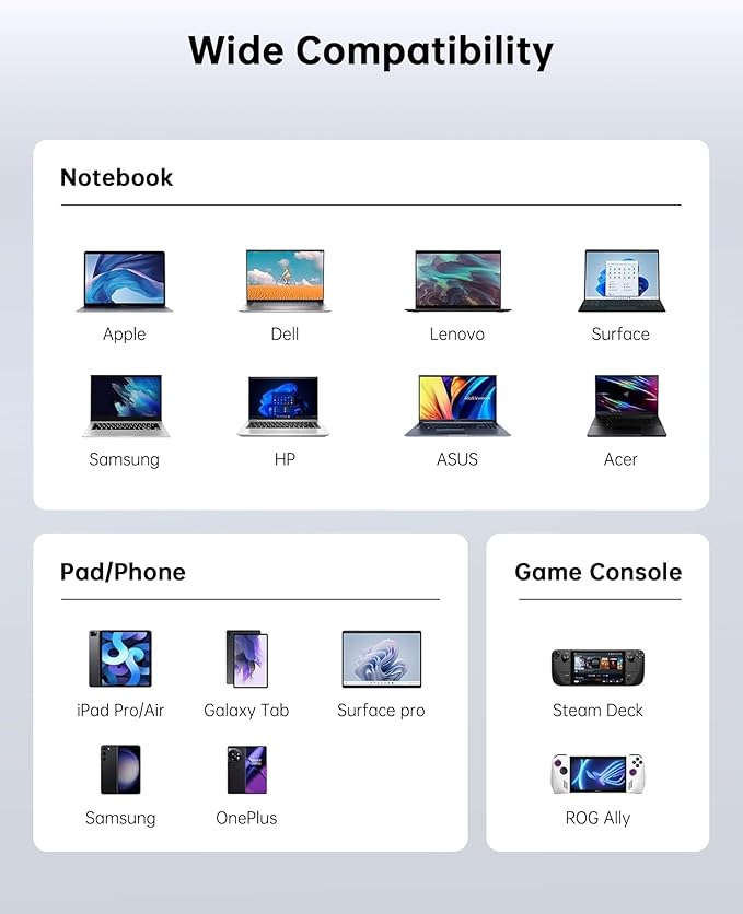 - Compatible Devices : Laptops,MacBook,Projector,HDTV,Monitor,Dell, HP, Lenovo, iPad, iPhone 15 Series, ASUS ROG Ally / Steam Deck / MacBook / MacBook Pro(2021/2020/2019/2018); Macbook Air 2018-2020, Mac mini 2018-2020, iPad Pro/ Air 2018/2020, iPad mini 6; Dell XPS 9380/ XPS 13 9365/ XPS 15 2018; Dell Latitude E7370/ E7470/ E7480/ Dell Latitude 13 7000/ E7370L/ New XPS 15 i7 Lenovo Yoga 720-13IKB/Yoga 910; Yoga15 Thinkpad Ultrabook Pro; Thinkpad E590/ Thinkpad P72/ Lenovo C930; Microsoft Surface Book 2/ Surface Laptop 3; Surface Pro 7/ Surface Pro 8/ Surface Go; Galaxy Book Flex Alpha 2-in-1 13.3" QLED Touch-Screen Laptop; Galaxy Tab S5e/ Galaxy Tab S4; HP Spectre Laptop 13-af001TU/ Spectre x360 13t; Elitebook 840 G5 series/ Elitebook x360 1030 G3; Envy Geforce mx250/ Z book 15u G3 ASUS Zenbook UX330UA/ Zenbook Flip ux370u; Acer Aspire 5 2019; D17w3 Aspire c24-865; Samsung Galaxy S10+/ S10/ S9+/ S9/ S8+/ S8 Plus; Note 10/ 9/ 8 Laptops,MacBook,Projector,HDTV,Monitor,Dell, HP, Lenovo, iPad, iPhone 15 Series, ASUS ROG Ally / Steam Deck / MacBook / MacBo⦠See more