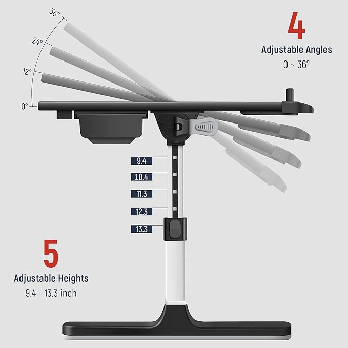 - 【Adjustable Laptop Bed Table】: Two auto-lock buttons on each side can change in height easily, the legs can be set to 5 different heights (adjustable from 9.4" - 12.6"), in addition two clamps can be used to adjust 4 different angles (from 0-36°).
