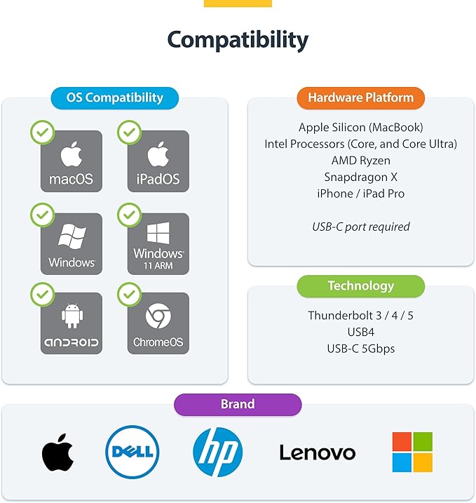 - BROAD COMPATIBILITY: Works seamlessly with USB-C and Thunderbolt laptops including Dell, HP, Lenovo, MacBook Pro / Air, Surface, Chromebook, and even USB-C enabled iPhone/iPad Pro; Compatible across Windows, macOS, iPadOS, iOS, Android, and Chrome OS