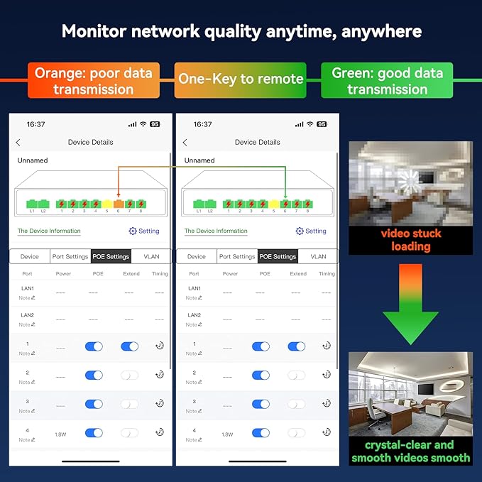 - Easy to Set-up And Cloud Managed PoE Switch: Connect devices securely, 19 port visibility, and simple cloud management with the mobile app and your computer; Alerts for connectivity problems and remote troubleshooting tools when needed. One-key to remote PoE function with mobile APP; Remote Access, feel free to Live check and solve the problems with your family or friends via POE Switch App wherever you are.(Please note: When adding a device for the first time, the switch needs to be connected to the Internet and powered on before the device can be activated.)