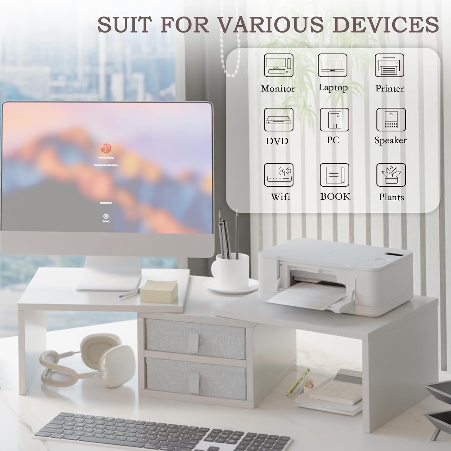 - 【Versatile Stand for 2 Devices】Dual monitor stands for 2 monitors, laptops, printers, computers.This 3 shelf desk shelf is designed to accommodate all your office equipment. Its versatile design ensures it fits your workspace, making it an helper for your home and office.