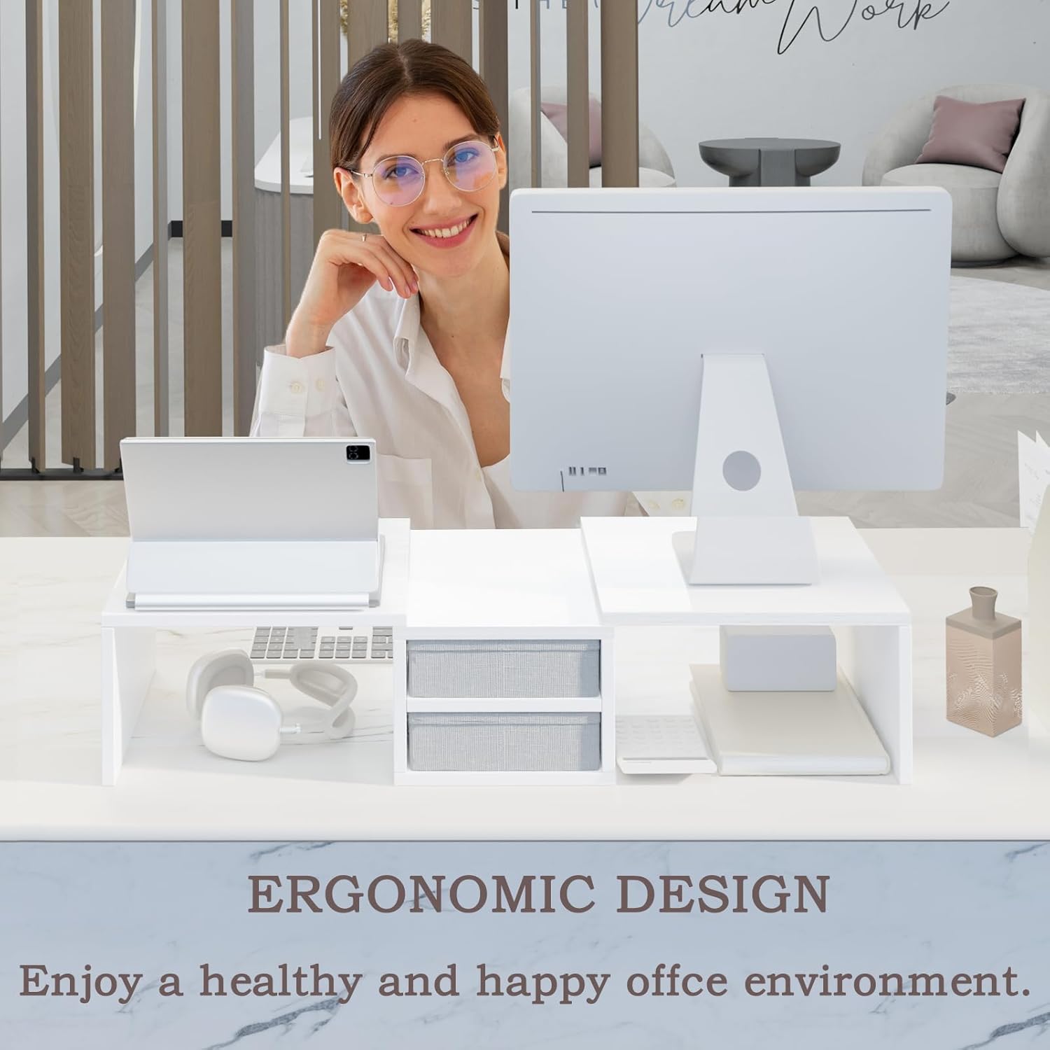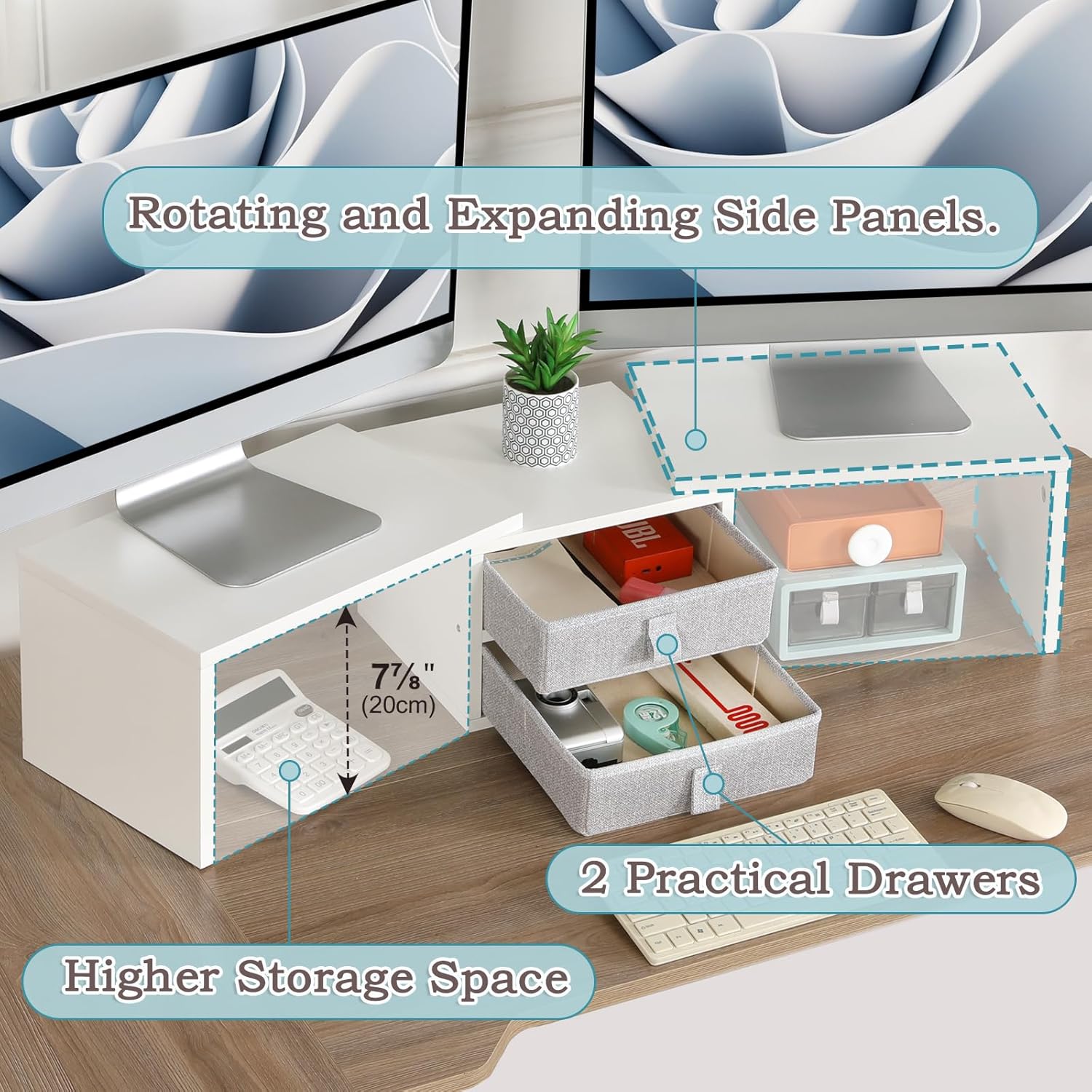 - 【Desk Organizer with 2 Drawers】Keep your workspace tidy with the built-in two-drawer storage box. This handy organizer allows you to stash away pens, papers, and other desk essentials, ensuring your desktop stays clutter-free and focused.