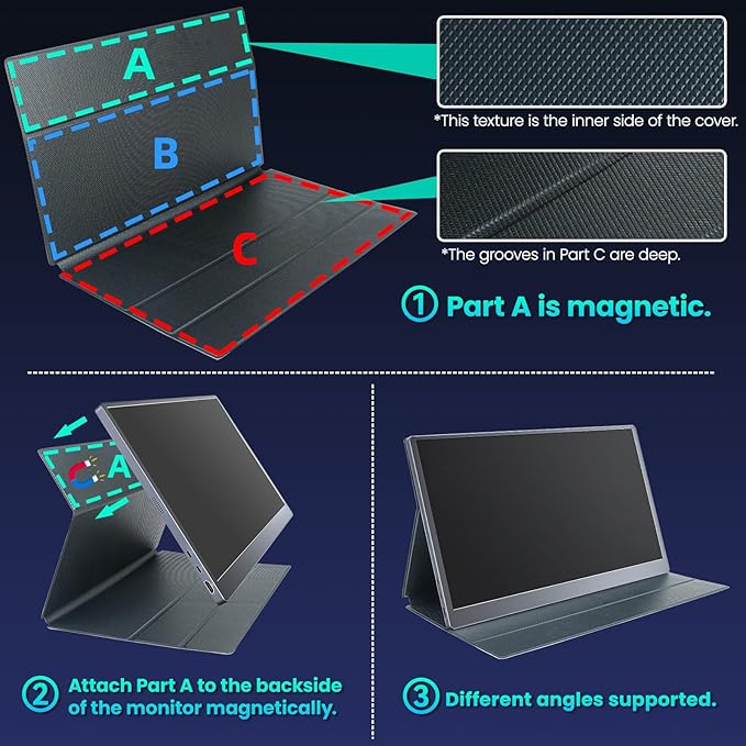 - VESA Mountable and Magnetic Cover Case: This 15.6 inch portable screen for laptop with four VESA holes on the back, so it can be easily and stably mounted on a stand for landscape and vertical mode. The VESA mount size is 75*75mm on the back of monitor, and we recommend to use M4*6mm screws for vesa mount. The high-quality PU leather magnetic cover case provides adequate protection