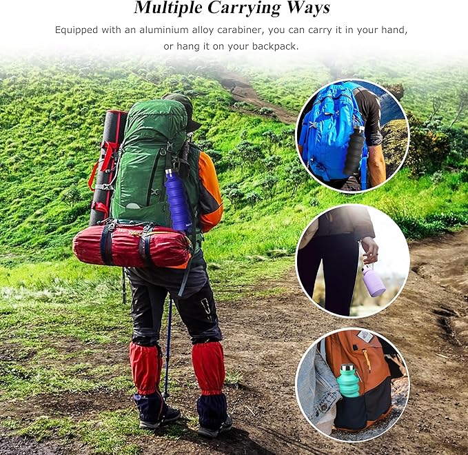 - Perfect for travel & sports - The shatter-proof, flexible and durable collapsible silicone water bottle equipped with a aluminium alloy carabiner, you can hook it to backpack or gym bag, carry it everywhere. Ideal for travel, gym, bikes, running, camping, fishing, hiking, climbing, yoga, beach, outdoor sports.