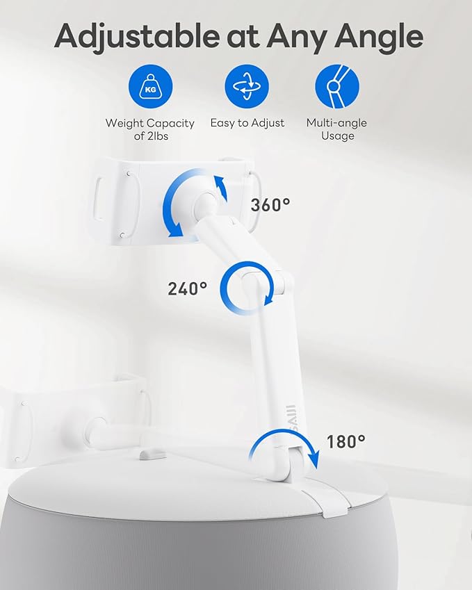 - Upgraded Double-jointed Arm: Deformable bean bag & 360° clamp mount & flexible Upgraded Double-jointed Arm meet the comfort of watching the screen when you are sitting, lying down or even reclining. So you can free your hands while relaxing your neck and keeping your sight aligned.