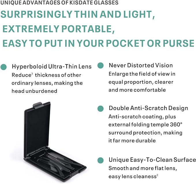 - Extremely Portable: Has a half-folded spectacle frame, multiple folding temples, and almost no thickness of the glasses case, this pair of foldable glasses can be put into most pockets or your wallet, occupying no space at all, extremely compact, and super portable. It can accompany you to any place