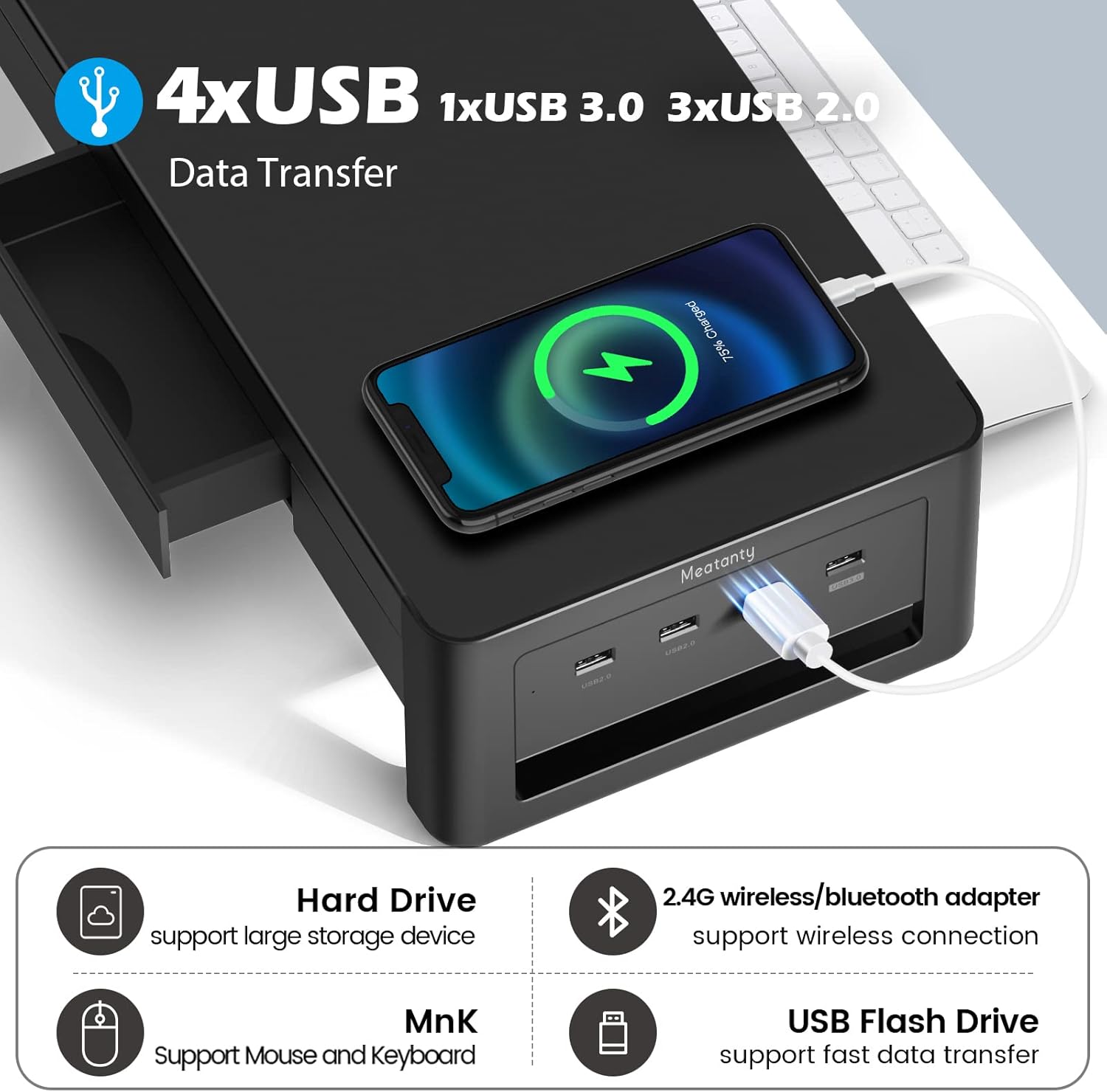 - 【Hub Expansion with 4 USB Ports】Meatanty dual computer monitor stand supports data transfer and hub function, which makes it easy to connect your USB devices such as smartphones, USB sticks, iPads, Kindles and other devices.