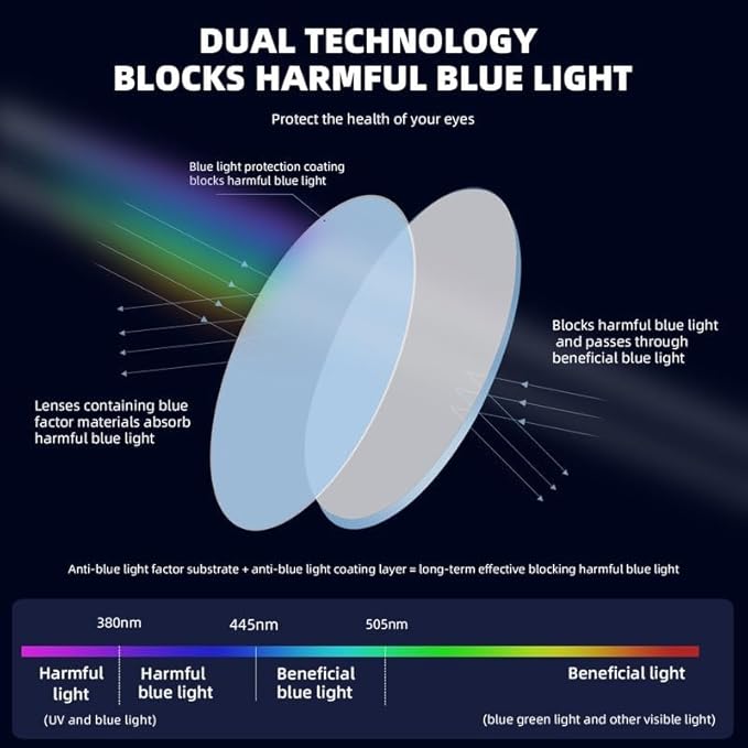 - [Anti Blue Light Glasses]Our anti-blue light lens adopts double protection technology, not only coating the surface of the lens with anti-blue light layer, but also adding blue light factor into the basic material of the lens, which can block harmful blue light more effectively for a long time.
