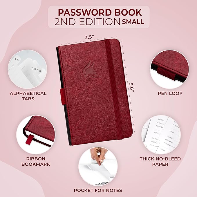 - COMPACT & PREMIUM QUALITY: This portable password notebook features a vegan leather hardcover, 120gsm no-bleed paper, lay-flat binding, pen holder, ribbon bookmark, back pocket, and handy 3.5 x 5.6 size.