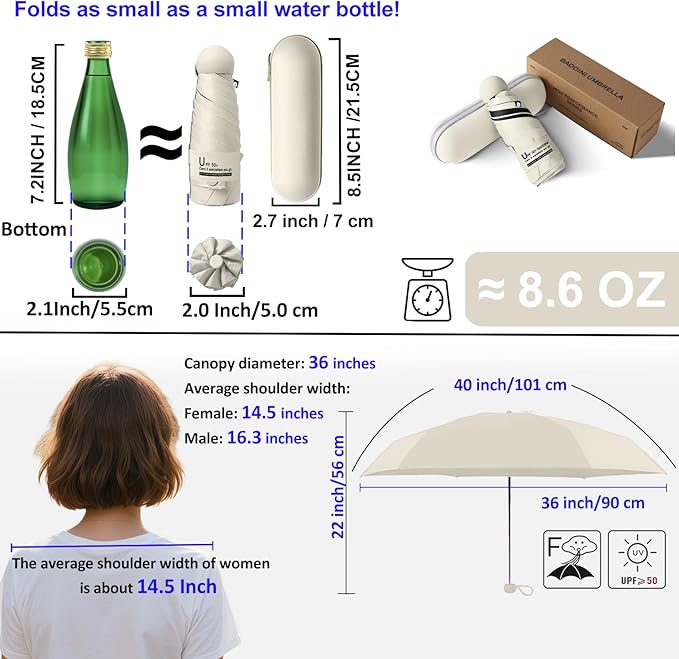 - Pocket umbrella: With a 40-inch arc and a 35.4-inch diameter, this mini travel umbrella is perfect for concealing in your purse or bag when youβre on the go! Folds to an ultra-compact 6.9 inches, makes the umbrella great for travel, as this super lightweight umbrella collapses about the size of your palm