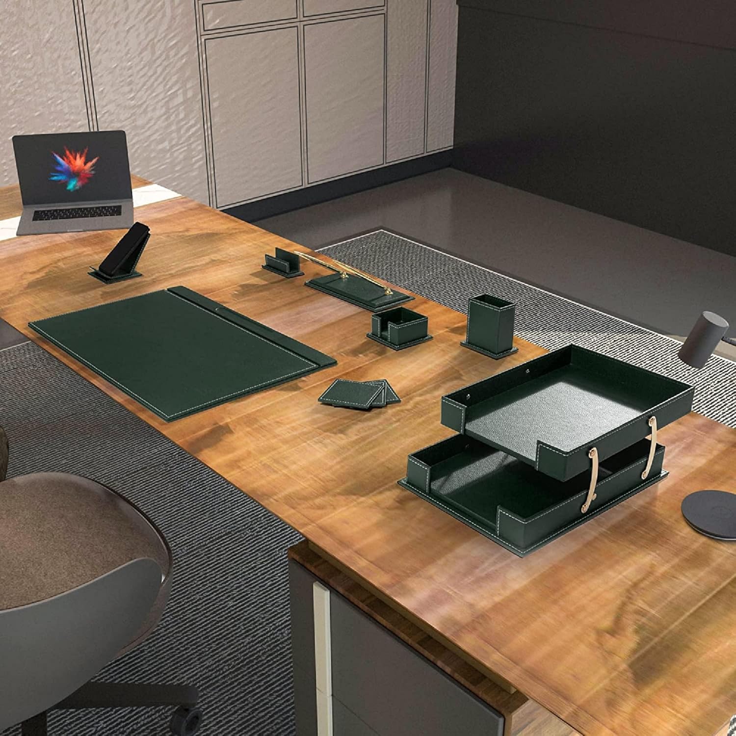- We are offering you the opportunity to find the office accessories that you need, conceived by our finest leather artisans. Made with authentic leather and in a unique palette of colors, you will definitely add a distinct touch of class to your office dΓ©cor. Our leather office sets are also well coveted among professionals who use them in conference or meeting rooms.