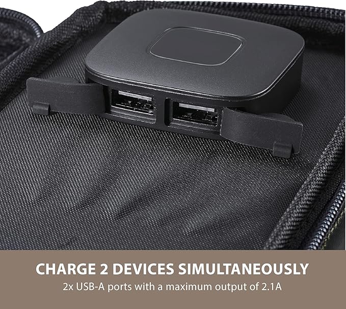 - ADJUSTABLE STANDS - Find the best angle to catch the sun with 2 built-in adjustable stands..DURABLE WATER-RESISTANT NYLON - The bag is made of a durable ripstop nylon that is water-resistant to handle daily use with ease..STORAGE BAG WITH POUCHES - The bag has two mesh storage pouches to store electronic cables or small items like carabiners..EXTERIOR HOOKS - There are three loops on the exterior of the bag for the added convenience of hanging from trees, tents, or cables..