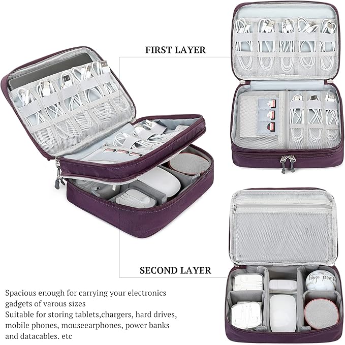 - Large Capacity: L9.4*W7.1*H4.3 inches (24*18*11 CM). Double layers design has enough space to store your chargers, cables, adapters, power bank, earphones, sd card, mouse, wireless charging-pads, cords, smartwatch and any small electronic accessiories.