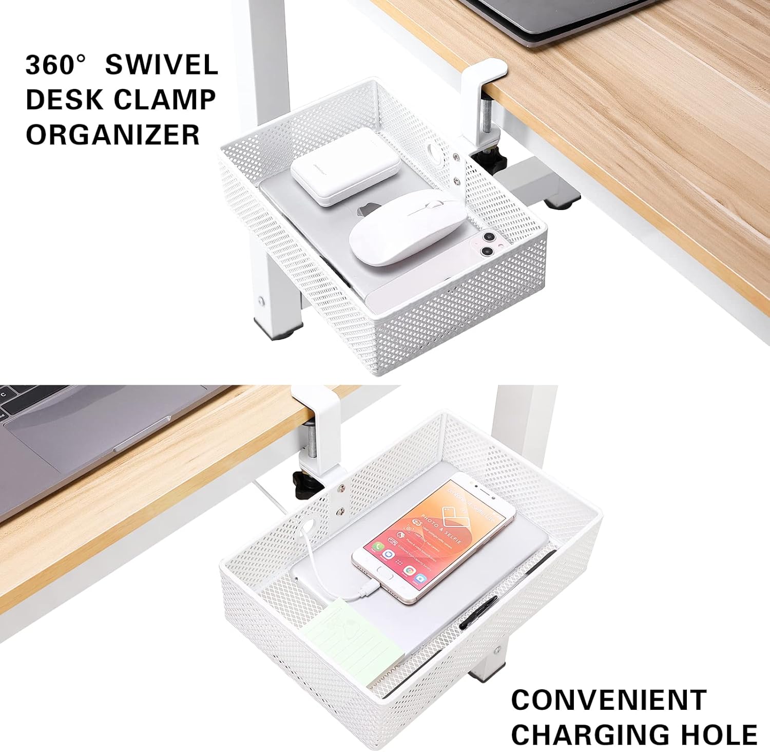 Mesh Desk Organizer and Clamp-on Swivel Pencil Drawer, Desk Hidden Desk Organizer Extra Sturdy C-Clamp Mount System and Easy to Instal, Home Office Art Supply Storage Box (White)