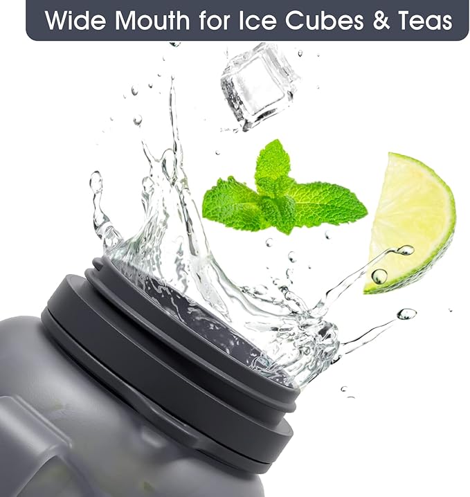 - Wide-mouth water bottle with straw, free to add ice cubes and make fruit teas: The large silicone water bottle with a 65mm diameter wide-open mouth makes it easy to clean. Not like other plastic gallon water bottles, this hydrated water bottle can be wristed and rubbed to remove sendimentary factors on the bottle wall. The water tracker bottle body can contain water temperature between -40 degree to 200 degree, you can add ice cubes and other tea supplements.