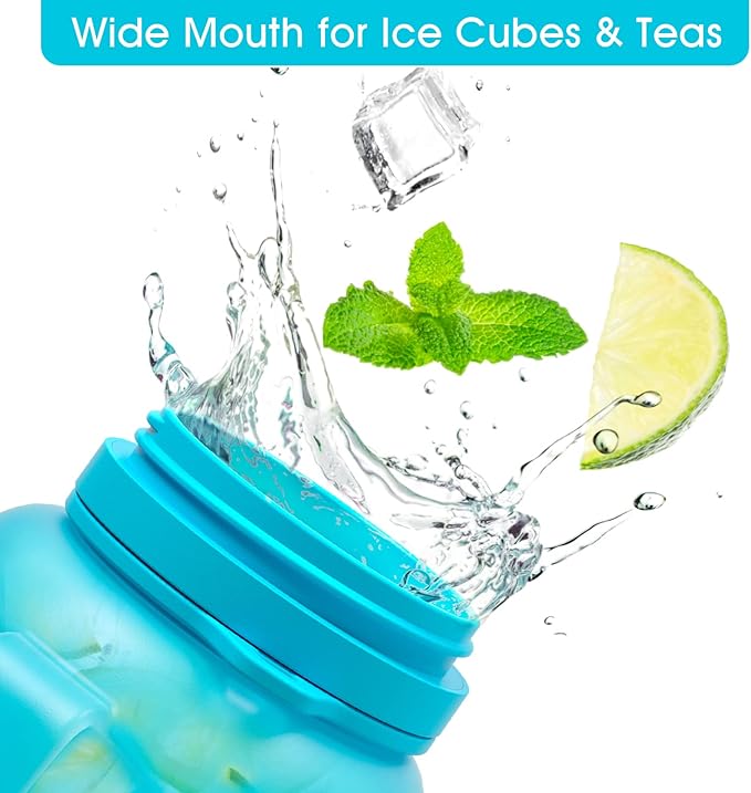 - Wide-mouth water bottles free to add ice cubes and make fruit teas: The bottle 65mm diameter wide-open mouth makes it easy to clean. Not as other plastic gallon water jug, this hydrated water bottle can be wristed and rubbed to remove sendimentary factors on the bottle wall. The water tracker bottle body can contain water temperature between -40 degree to 200 degree, you can add ice cubes and other tea supplements.