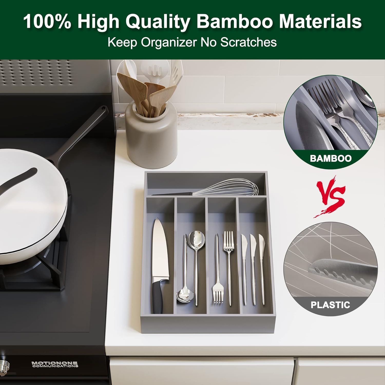 - ✅【MADE OF NATURAL BAMBOO】Our flatware organizer is made of natural bamboo. The material is taken from bamboo that have grown for more than 4 years which make our silverware holder for drawer use a durable kitchen piece that ll last you for years. The Environmentally material keep our flatware & utensil water and odor resistant. Even the knife won't leave scratch on it.