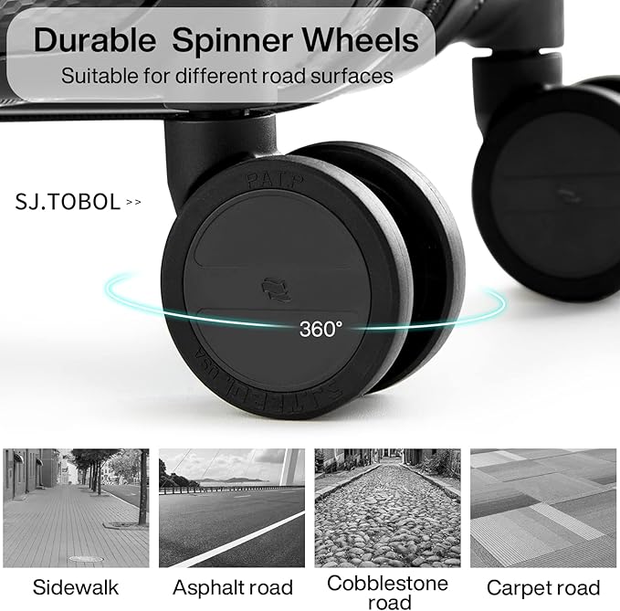 - 【High Quality Accessories】SJ . TOBOL durable spinner wheels,It is composed of precision shaft center and thickened TPE wheel skin, which is very wear-resistant,quieter and has strong bearing capacity, It is applicable to different roads such as cobblestone road and carpet road. Smooth and durable 5-strand reinforced explosion-proof zipper reverse coil prevents burst zipper. Travel-approved combination lock is safe and convenient. Ergonomics telescopic handle with multi-steps adjustment.