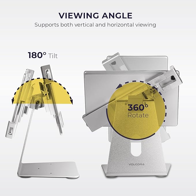 Volcora Anti-Theft Tablet Stand iPad Security Holder with Lock, Silver 10-13 Inch Kiosk Stand Mount, Swivel, Adjustable, for iPad Pro, Air, POS Register, Retail Business, Checkout, Cashier
