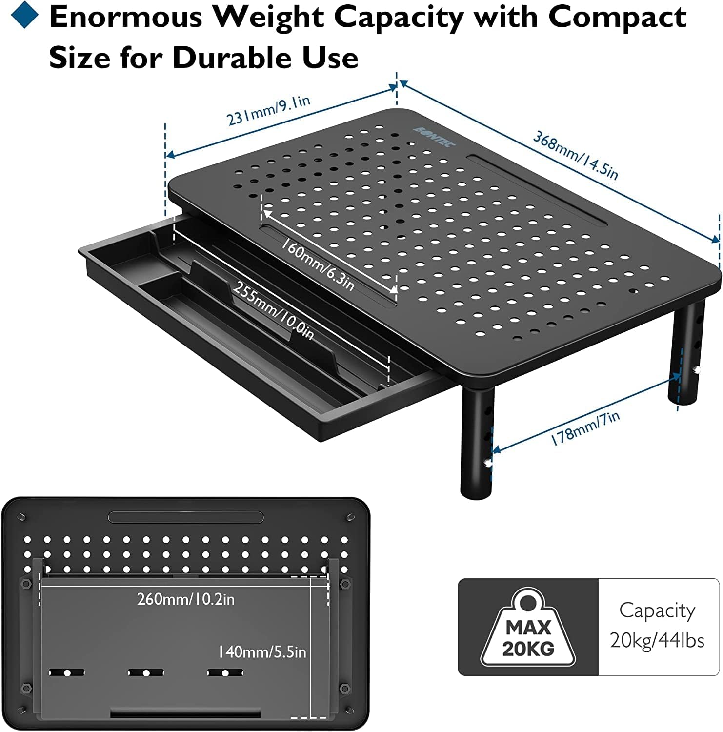 - QUICK AND TOOL-FREE ASSEMBLY - The adjustable computer monitor riser is quick to install, requiring no additional tools. Users simply screw the four legs into the mesh platform, completing the process in less than one minute. This straightforward setup makes the monitor riser with drawers ready for use immediately, improving comfort and organization without complex instructions or time-consuming steps