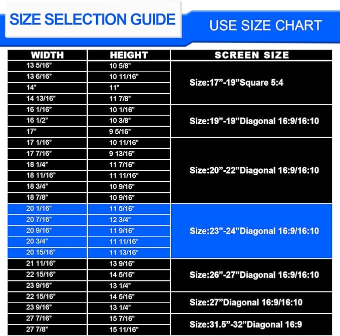 - HD Anti-Scratch Coating Process: The privacy screen filter fits for 23.6”23.8”24”widescreen monitors with a 16:9 aspect ratio. Actual Filter Size: Width: 21.22 inches , Height: 12.6 inches. It is designed with a combination of high-definition anti-blue light privacy film and acrylic anti-scratch technology, which greatly improves the clear view for you and protection of the product. Please verify your computer screen's width and height size, not recommended to based only on the diagonal size