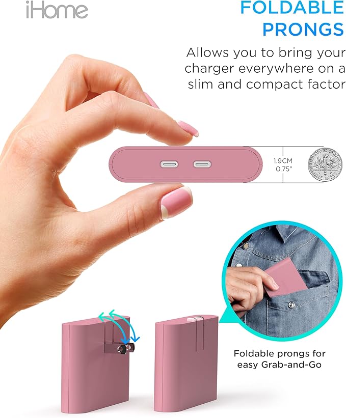 - TRAVEL-FRIENDLY: Experience hassle-free travel with the iHome AC Pro's PD charger, featuring foldable prongs for easy packing and carrying. With our charging blocks USB-C fast charging, you can ensure that your devices are always charged, no matter where you are.