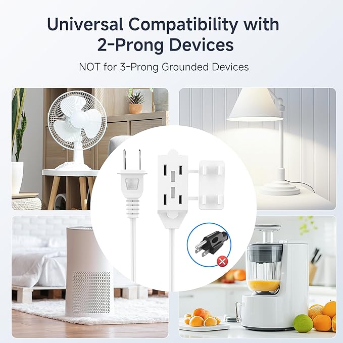 - Versatile Indoor Extension Cords: These white extension cords extend the reach of a 2 prong power cable for indoor devices like lamps, chargers, and small electronics. Each extension cord easily plugs into a standard 3-prong, 120V AC outlet.