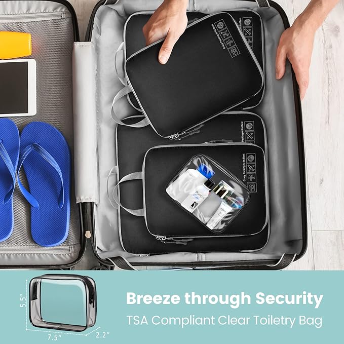 - Pack Light for Travel, No Wasted Space: Every inch counts with these travel packing cubes compression designed to fit suitcases perfectly; No more wasted space or overstuffed bags. Large(17.7"x12.6"x3.7") for jackets, sweaters, and trousers, Medium(13.8"x9.5"x3.7") for shirts and dresses, Small(11.5"x8.6"×3.7") for underwear and socks and 1 clear toiletry bag for holding your cosmetics, toiletries