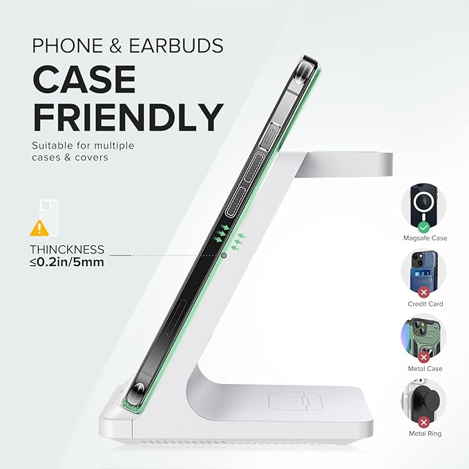 - NO NEED TO TAKE OFF YOUR PHONE&EARBUDS CASE-It a easy-to-use 3in1 wireless charging dock can also charge your smartphone and earbuds through the protective cases&covers up to 0.2in(5mm) and both portrait and landscape mode. NOTE: if your case&cover with the Credit Cards/Ring Plate/ Magnetic Pad/Metal, our product will stop working to protect your devices. Specially, Magsafe Case can work with our product.
