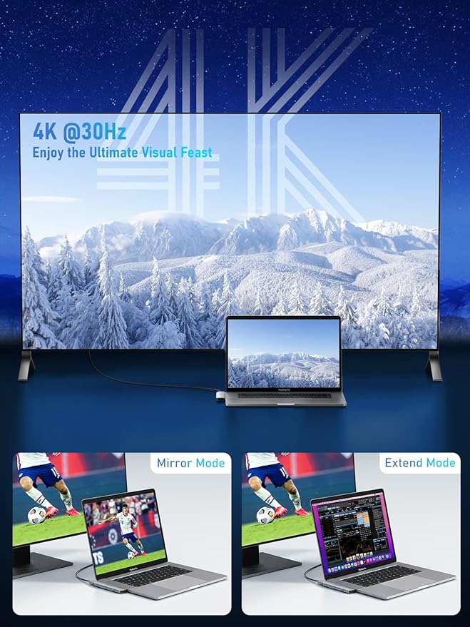 - [Powerful HDMI Adapter for MacBook]: Use HDMI port to enter mirror mode for Mac OS or extended mode and transfer vivid 4K Ultra HD @30Hz or Full HD 1080p @60Hz video with 3D effect from laptop screen to monitor, projector, HDTV, etc. Stream movies, presentations or video games on your monitors with one click. Please note: * Thunderbolt 3 port can be used with HDMI port simultaneously.