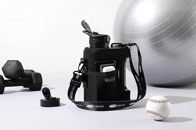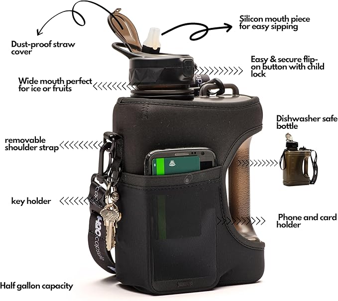 - STAY HYDRATED IN STYLE: No more wrestling with your keys, or leaving your phone on the dirty gym floor. The H2O Capsule is the only sports water bottle with a protective sleeve that doubles as handy storage! Hold your phone, keys and cards while you work out and look good doing it. This half gallon jug is designed with durable materials with a handle to carry wherever you go!