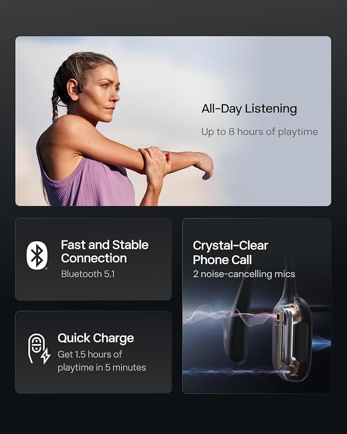 - 10 Hours of Playtime & Quick Charge: Enjoy a seamless 10-hour experience of music, calls, and podcasts with OpenRun Pro. A quick 5-minute charge adds 1.5 hours of battery life for uninterrupted enjoyment. Ideal for running, cycling, remote work, gaming, and workouts.