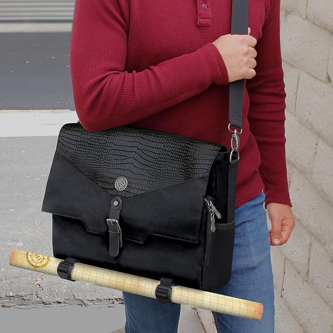ENHANCE Collector's Edition RPG Player's Essentials DnD Bag - Dragon Hide Exterior Messenger Bag Fits 2-4 Books, Binders, Dice & Accessories, with 17 inch Laptop Slot, Battlemap Straps (Dragon Black)
