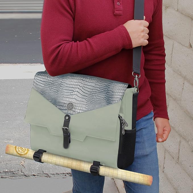 ENHANCE Collector's Edition RPG Player's Essentials DnD Bag - Dragon Hide Exterior Messenger Bag Fits 2-4 Books, Binders, Dice & Accessories, with 17 inch Laptop Slot, Battlemap Straps (Dragon Silver)